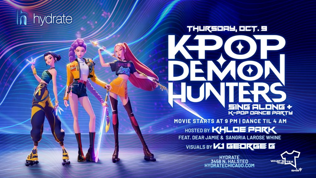 Kpop meets the big screen at Hydrate! Join us for a K-Pop Demon Hunters Sing-Along + Dance Party! Watch the movie, belt out your favorite tracks, then dance all night to the hottest K-pop beats.